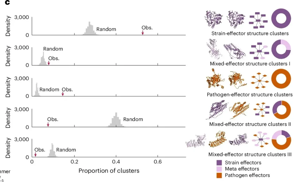 f . Os nós cinzas representam proteínas humanas; as proteínas humanas da camada externa são alvos apenas da cepa mais próxima, enquanto as proteínas humanas centrais são alvos de efetores de múltiplas cepas. Imagem: Artigo Nature: https://www.nature.com/articles/s41564-025-02241-y