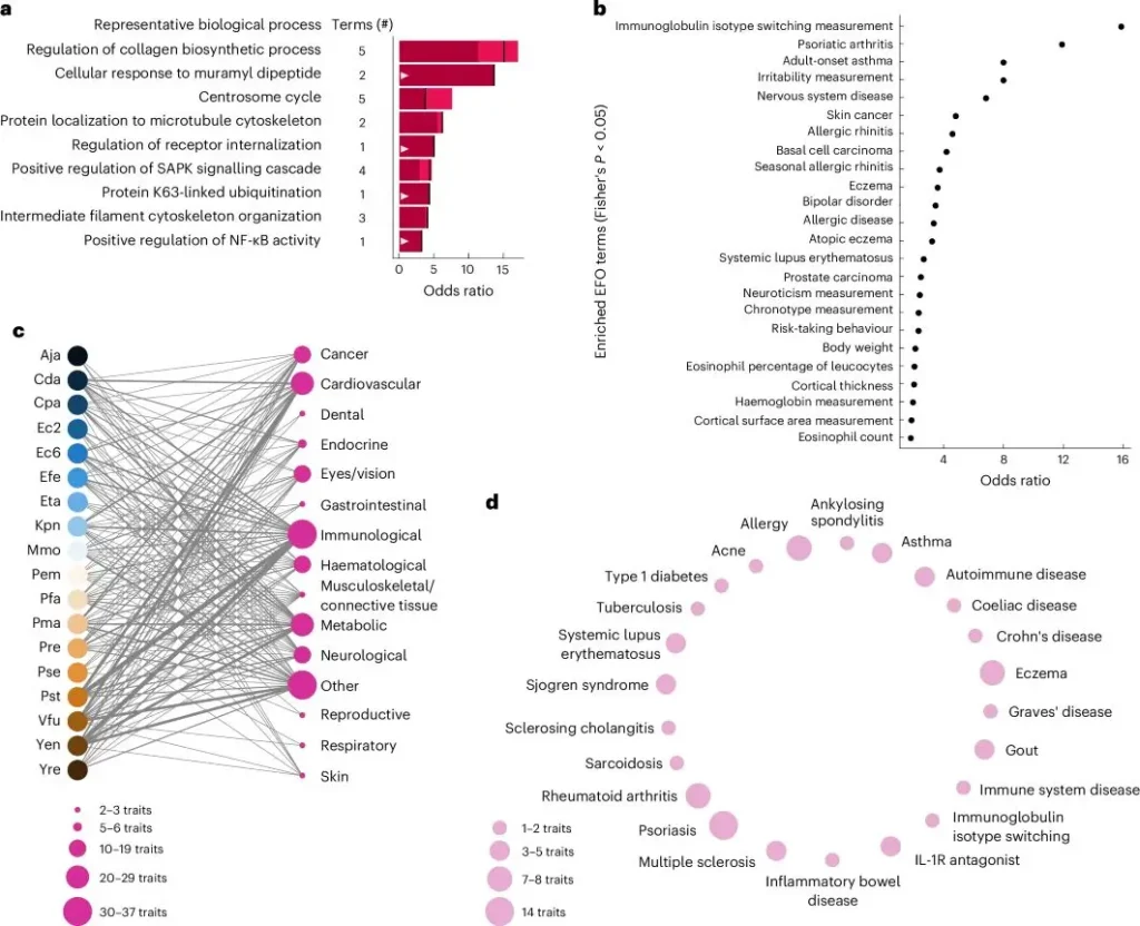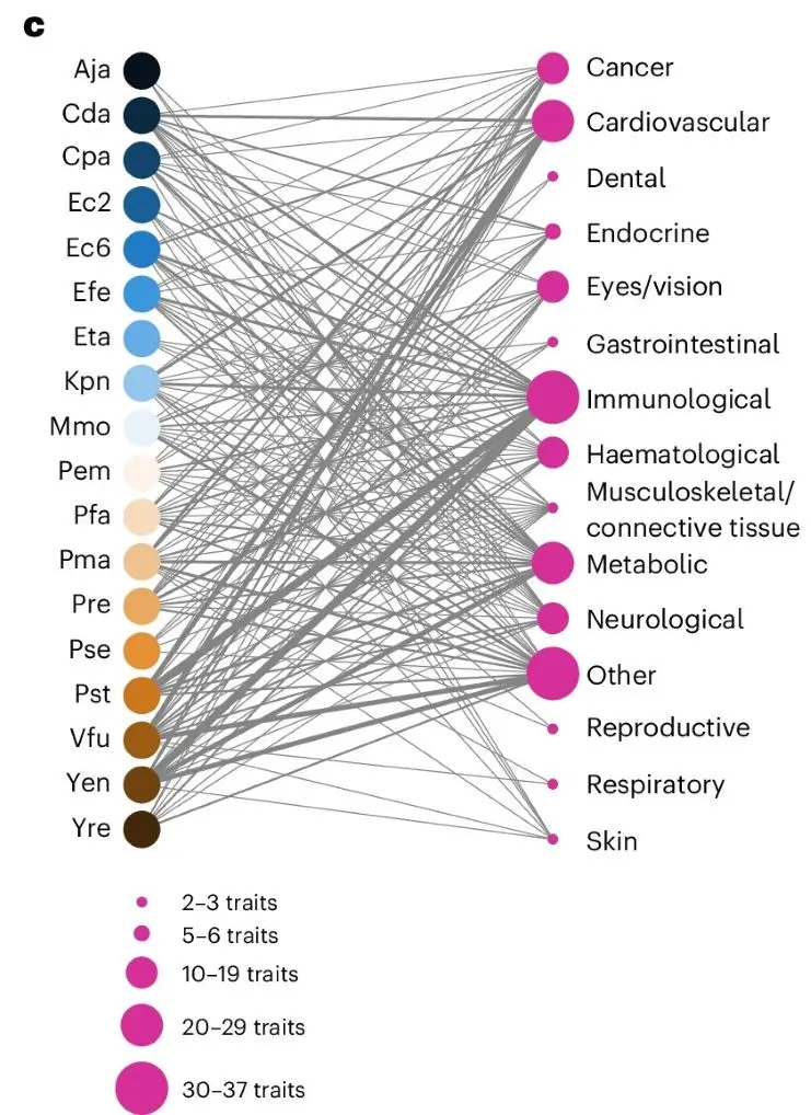 Função e associação com doenças de proteínas humanas direcionadas a microrganismos. Grupos de doenças para os quais proteínas de predisposição genética são enriquecidas em vizinhanças de rede de efetores das cepas indicadas. O tamanho do nó da característica corresponde ao número de características significativamente alvo nesse grupo, conforme indicado na legenda. A espessura das arestas cepa-grupo reflete o número de ligações efetor-característica significativas subjacentes. Imagem: Artigo Nature: https://www.nature.com/articles/s41564-025-02241-y