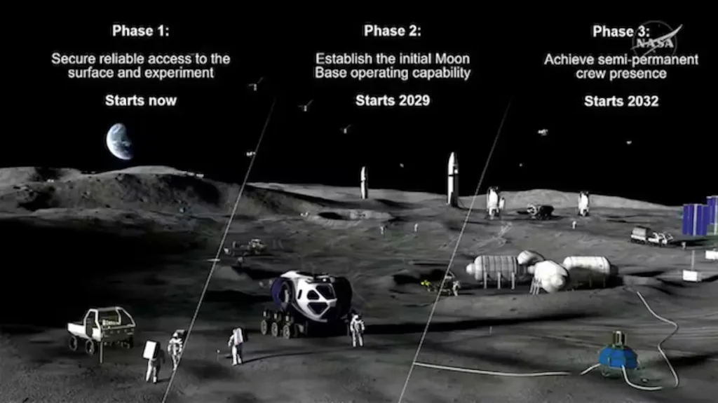 Para garantir uma presença humana permanente na Lua, a NASA também anunciou uma abordagem faseada para a construção de uma base lunar.