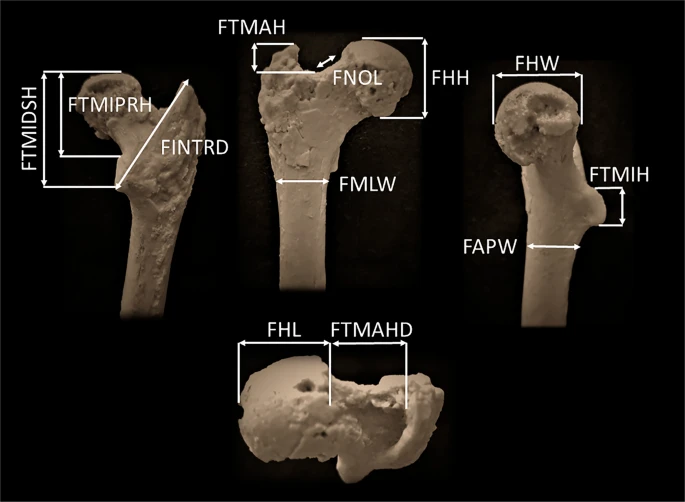 O colo femoral alongado, os pontos de fixação muscular especializados e a camada óssea externa espessa correspondem a padrões associados à sustentação de peso durante a marcha ereta.