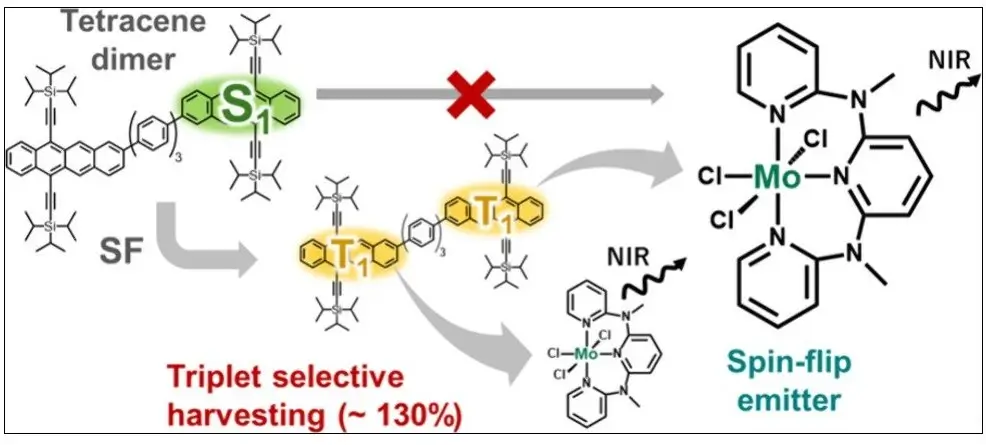 Nessas moléculas, um elétron inverte seu spin durante a absorção ou emissão de luz infravermelha próxima, permitindo que o sistema aceite a energia triplete produzida na fissão de spin (SF).