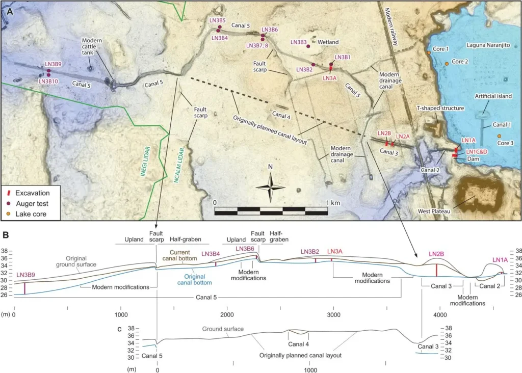 Outro componente importante da pesquisa foi a análise do sistema hidráulico: canais de até 35 metros de largura e cinco metros de profundidade, além de uma barragem construída na borda da Laguna Naranjito.