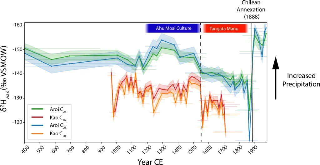 Os pesquisadores analisaram sedimentos de duas fontes de água doce da ilha – Rano Aroi e Rano Kao – reconstruindo um registro de 800 anos de padrões de chuva através da composição isotópica de ceras foliares preservadas.