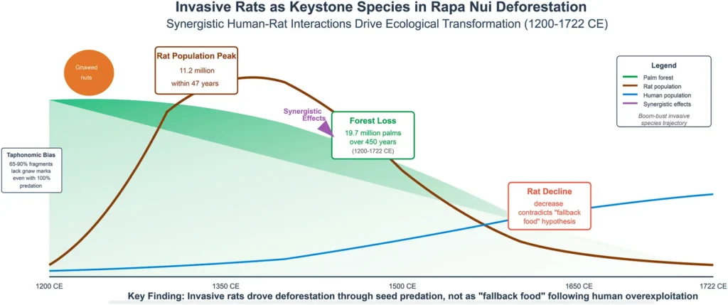 Arqueólogos e antropólogos desvendaram a complexa teia multi causa que levou ao colapso ecológico e social na Ilha de Pascoa, em que ratos inseridos não intencionalmente e mudanças climáticas tiveram forte impacto.