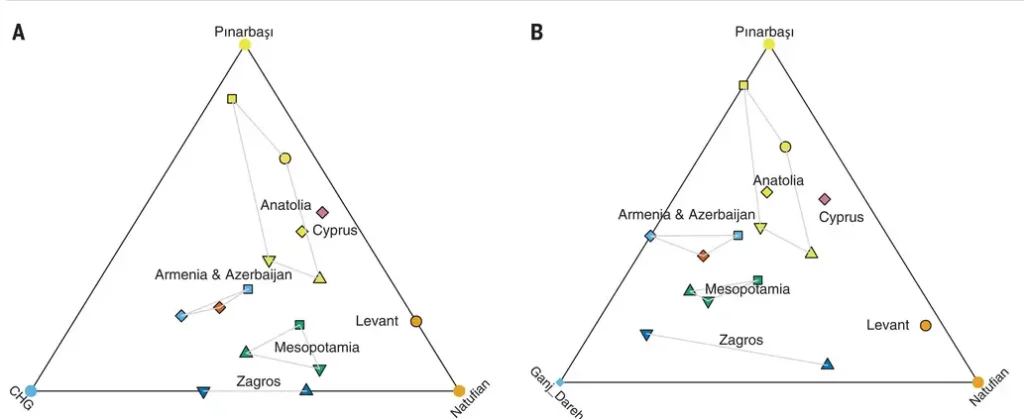 Especificamente na região da Atanólia, atual Turquia, os resultados revelam uma mistura de fontes pré-neolíticas relacionadas a três origens: caçadores-coletores da Anatólia, do Cáucaso e do Levante, e mostram que essas primeiras culturas agrícolas formaram um contínuo de ancestralidade que reflete a geografia da Ásia Ocidental.