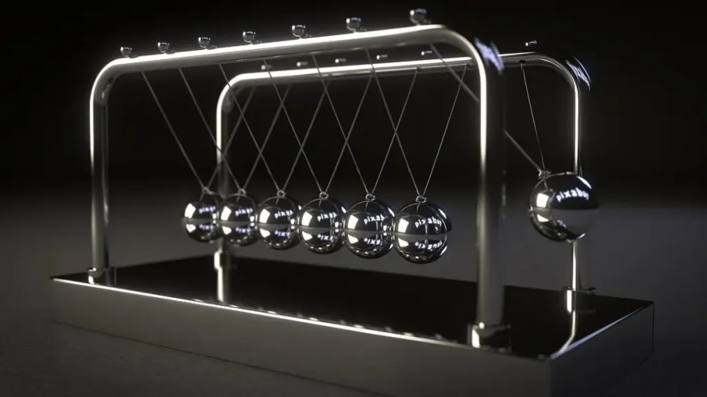 Quando uma bola é puxada para trás e solta, ela transfere seu momento linear diretamente através das outras para a bola na extremidade oposta, que oscila como se não tivesse sido tocada.