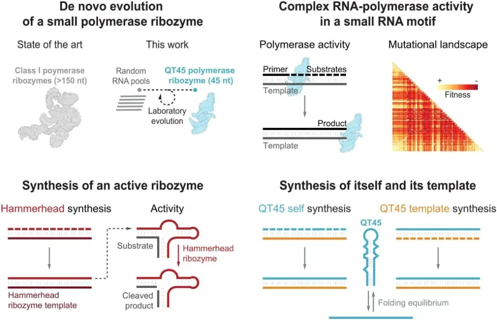 Nesse ambiente de laboratório, o QT45, que compreende apenas 45 nucleotídeos, provou que podia atuar como uma polimerase. Ele construiu uma fita de RNA complementar e então a usou como molde para criar uma cópia totalmente nova.