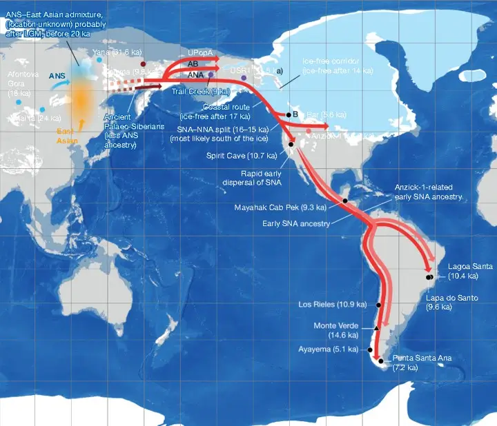 Estudos genéticos sugerem que os primeiros povos a chegar às Américas descendem de um grupo ancestral de antigos siberianos do norte e asiáticos orientais que se misturaram há cerca de 20.000 a 23.000 anos.