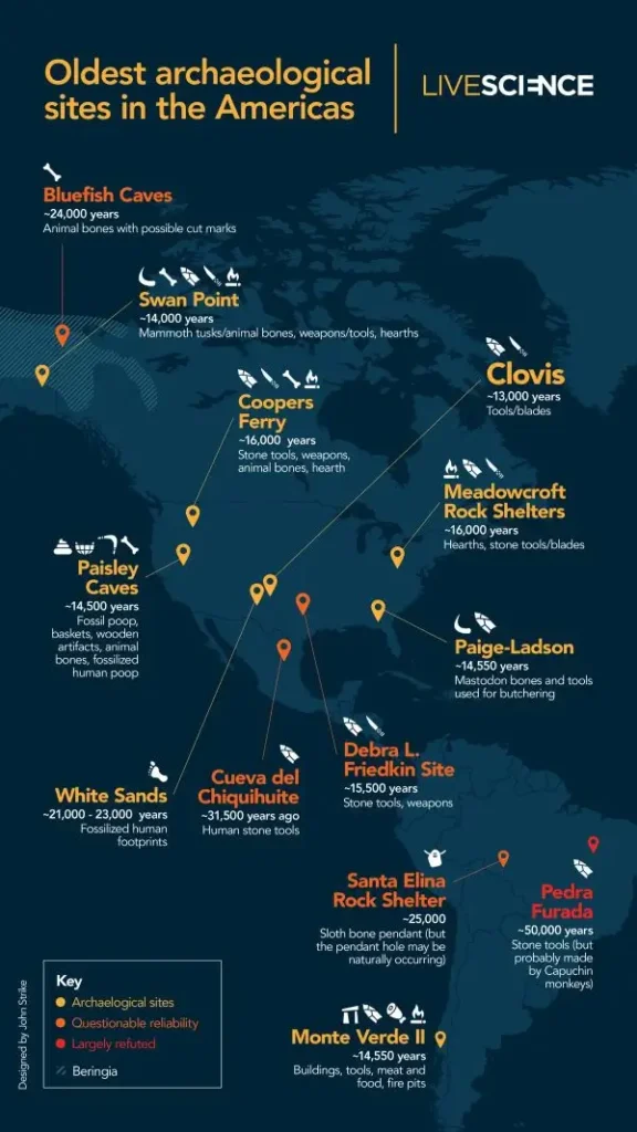 Page-Ladson, um sítio pré-Clovis na Flórida com ferramentas de pedra e ossos de mastodonte, data de cerca de 14.550 anos atrás. E Cooper’s Ferry — um sítio que inclui ferramentas de pedra, ossos de animais e carvão — data de cerca de 16.000 anos atrás.