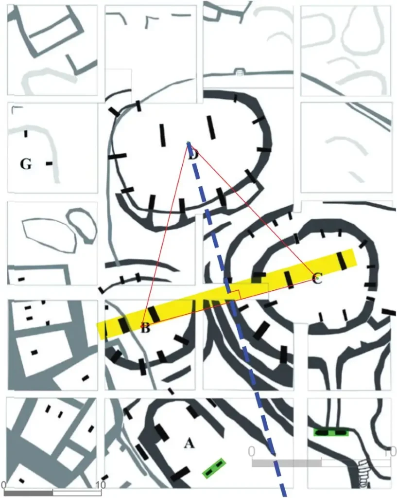 As novas estruturas retangulares que se acredita terem servido como habitações, ao lado dos edifícios monumentais circulares já conhecidos. Medições para determinar o tamanho e os limites do monte também estão em andamento.