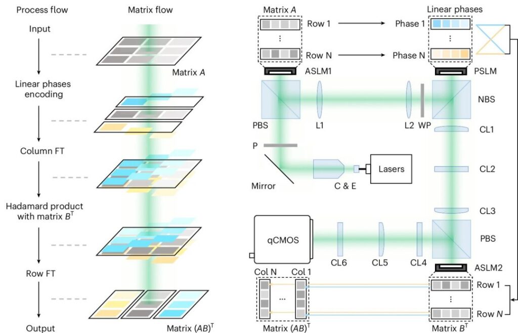 Conforme os autores, a Multiplicação Paralela de Matrizes Ópticas (POMMM), permite o processamento de tensores totalmente paralelo por meio de uma única propagação de luz coerente.