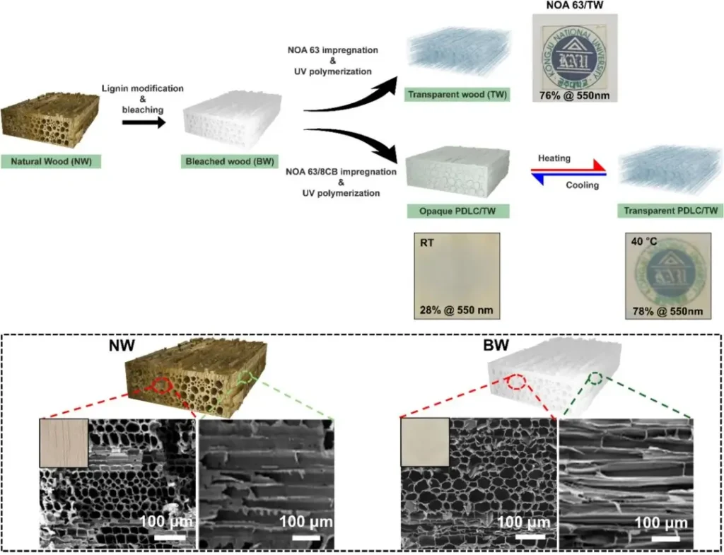 As madeiras transparentes termocrômicas (MTs) comutáveis são fabricadas para janelas inteligentes utilizando, pela primeira vez, polímero de cristal líquido disperso (PDLC) curável por UV em madeiras modificadas.