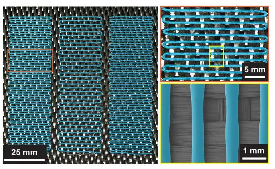 Primeiro, um agente de cura termoplástico é depositado por impressão 3D sobre o reforço de fibra, criando uma camada intermediária com padrão polimérico que torna o laminado de duas a quatro vezes mais resistente à delaminação.