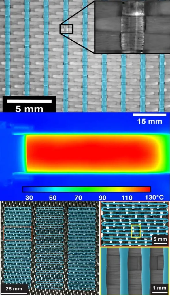 Segundo, finas camadas de aquecimento à base de carbono são incorporadas ao material, que se aquecem quando uma corrente elétrica é aplicada; o calor derrete o agente de cura, que então flui para dentro de fissuras e microfraturas e religa as interfaces delaminadas, restaurando o desempenho estrutural.
