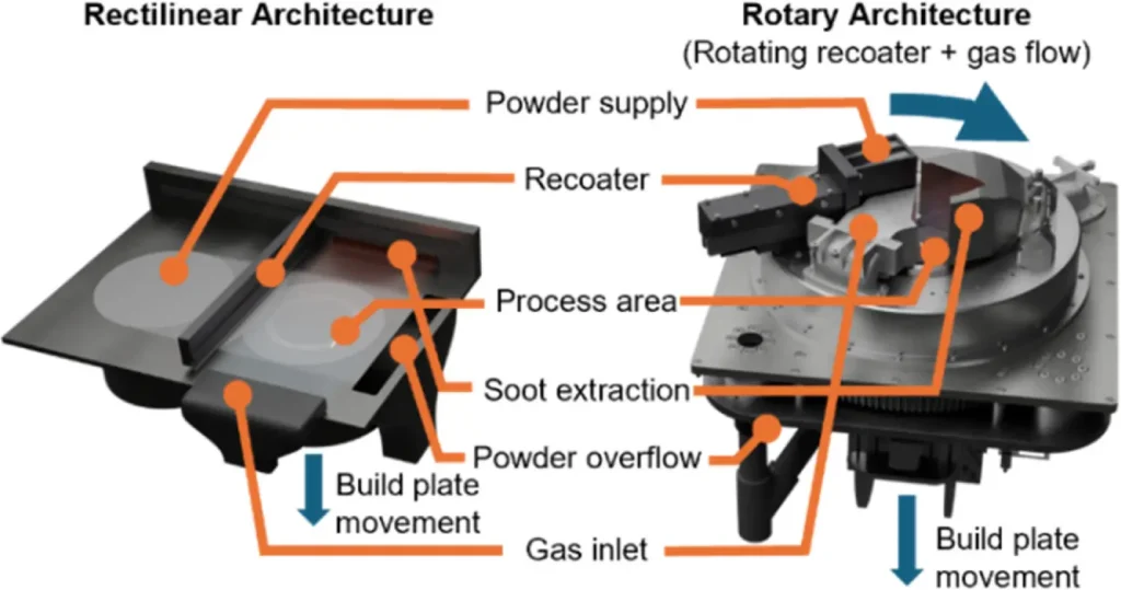 Ao contrário das máquinas convencionais de fusão a laser em leito de pó retilíneo, onde uma nova camada de pó precisa ser aplicada após a fusão de cada camada anterior, a máquina RAPTURE funciona ininterruptamente graças à sua plataforma rotativa.