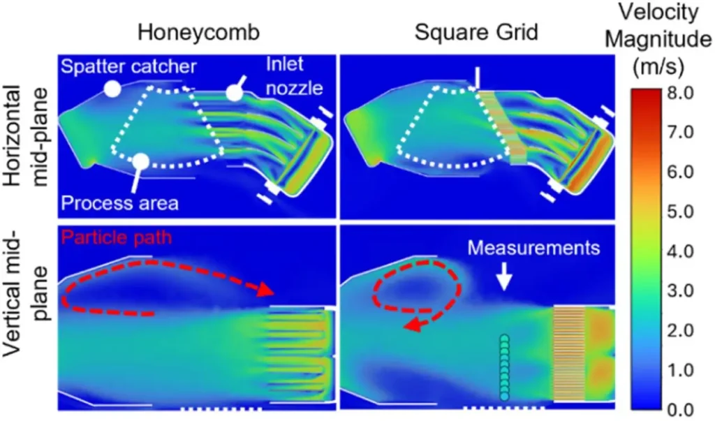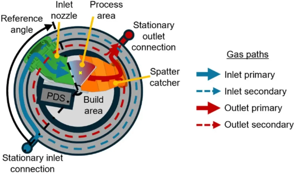 A máquina possui um mecanismo que sopra gás inerte sobre a área onde o pó é fundido. Isso impede a oxidação do componente durante a impressão. Fuligem, respingos e outros subprodutos são extraídos sistematicamente por uma saída.