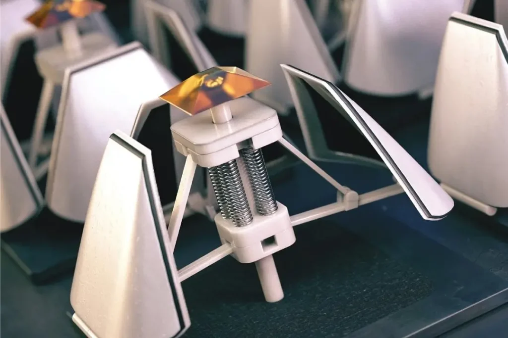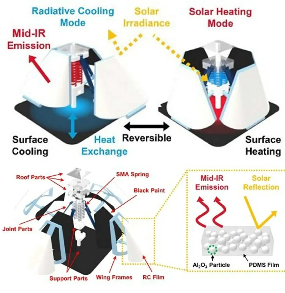 Quando a estrutura tridimensional do dispositivo está fechada, sua superfície reflete o calor solar e emite luz infravermelha média, funcionando no modo de resfriamento ao enviar o calor para o frio do espaço, já que a atmosfera é transparente para o comprimento de onda emitido.