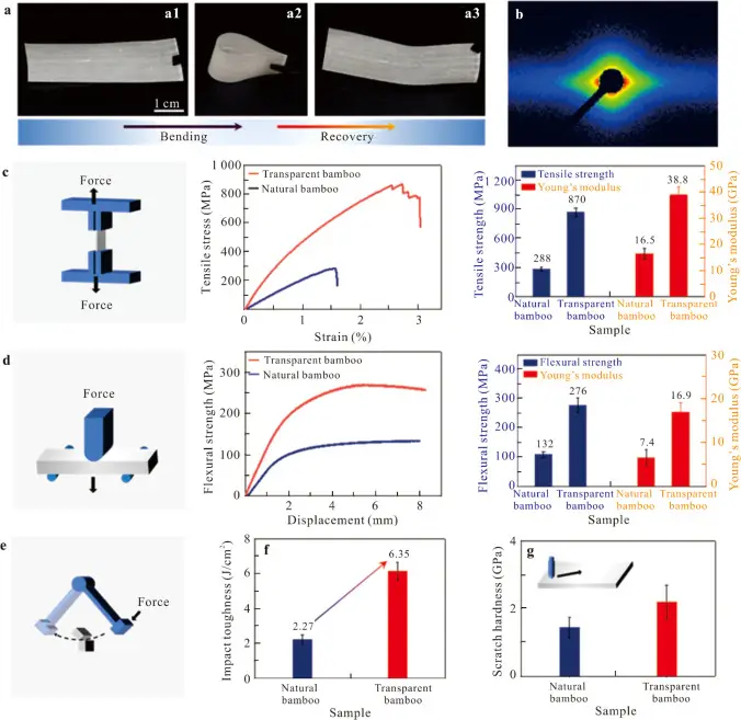 Desempenho mecânico do bambu transparente. Imagem: Artigo: https://www.sciencedirect.com/science/article/pii/S2369969825000702