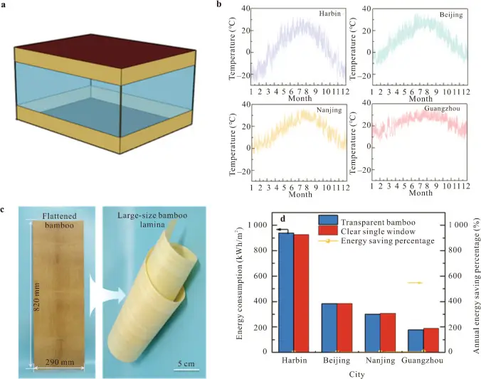 Simulação de economia de energia com bambu termocrômico transparente como janela. Imagem: Artigo: https://www.sciencedirect.com/science/article/pii/S2369969825000702