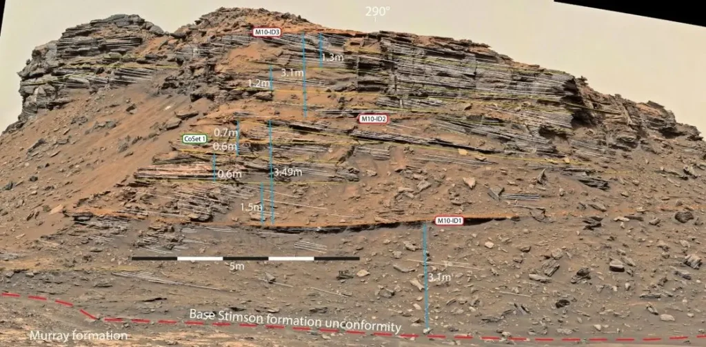 Para o estudo, a equipe examinou dunas na Formação Stimson (SF), um sistema de areia eólica e rochas sedimentares na Cratera Gale.