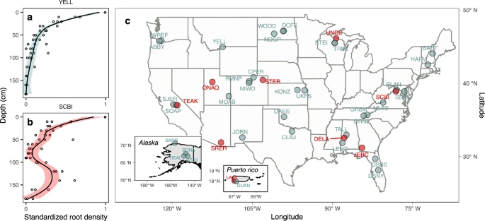 Exemplos de perfis de profundidade de enraizamento e a ampla distribuição bimodal de enraizamento na rede NEON. Imagem: Nature Communications. https://www.nature.com/articles/s41467-025-60055-2#citeas