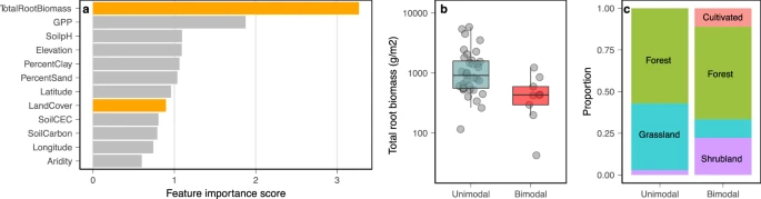 Bimodalidade radicular prevista por fatores ao nível do local.. Imagem: Nature Communications. https://www.nature.com/articles/s41467-025-60055-2#citeas