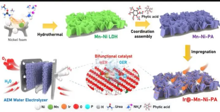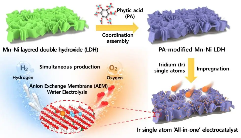 Os pesquisadores do KIST utilizaram tecnologia de controle de precisão em nível atômico para dispersar uniformemente átomos de irídio (Ir) na superfície de um suporte de hidróxido duplo lamelar (HDL) à base de manganês (Mn) e níquel (Ni), incorporando ácido fítico.