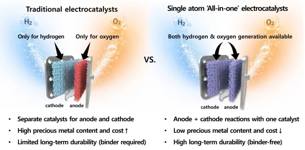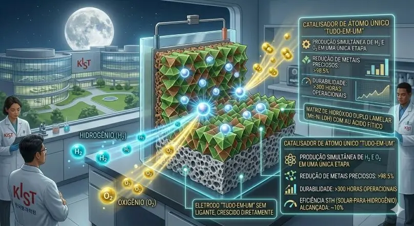 É aqui que entra a inovação revolucionaria dos cientistas sul-coreanos. Eles desenvolveram um catalisador inédito de átomo único que permite a produção simultânea de Hidrogênio (H₂) e Oxigênio (O₂), em uma única etapa a partir da hidrólise da água, com uma eficiência inédita, além de reduzindo o uso de metais preciosos.