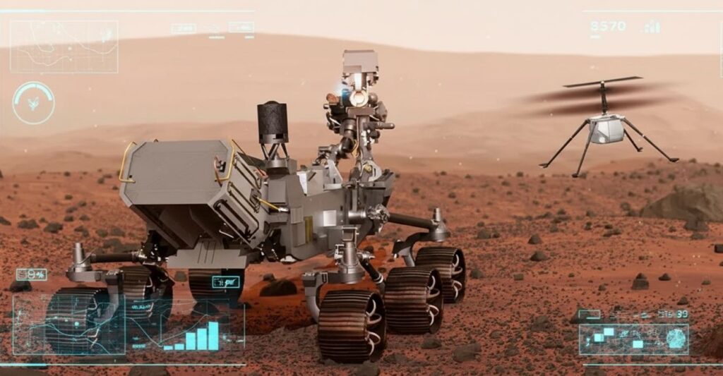 lustração do Rover Perseverance para sondar o solo Marciano, junto com o helicóptero Ingenuity, Em especial, a missão tem objetivos de busca de vida da astrobiologia. Imagem: Gemini, Google. referencia da Nasa