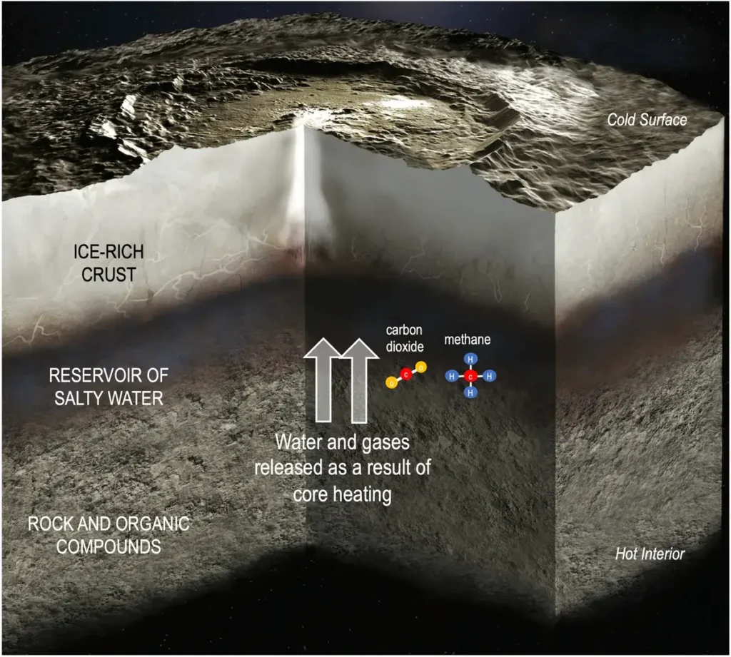 Uma das descobertas mais intrigantes da missão Dawn é que a gigantesca rocha espacial provavelmente abriga água: traços de água e minerais salgados na superfície gelada do planeta anão sugerem que um grande reservatório de salmoura esteja aprisionado a quilômetros de profundidade.