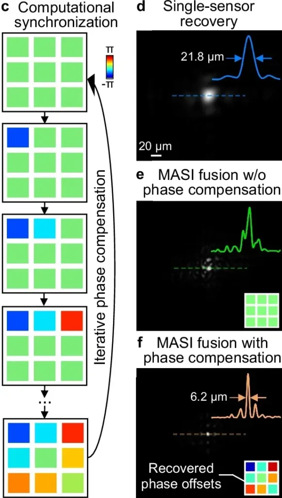 Um processo computacional de sincronização de fase ajusta então as diferenças de fase relativas entre os sensores. Essa otimização iterativa aumenta a coerência e concentra a energia na imagem reconstruída final.