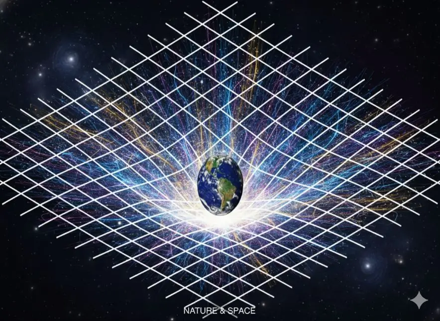 representação artística de como a Terra cria uma distorção no espaço-tempo, de acordo com a teoria da relatividade geral. Imagem: NASA. Ajustes Gemini, IA do Google.