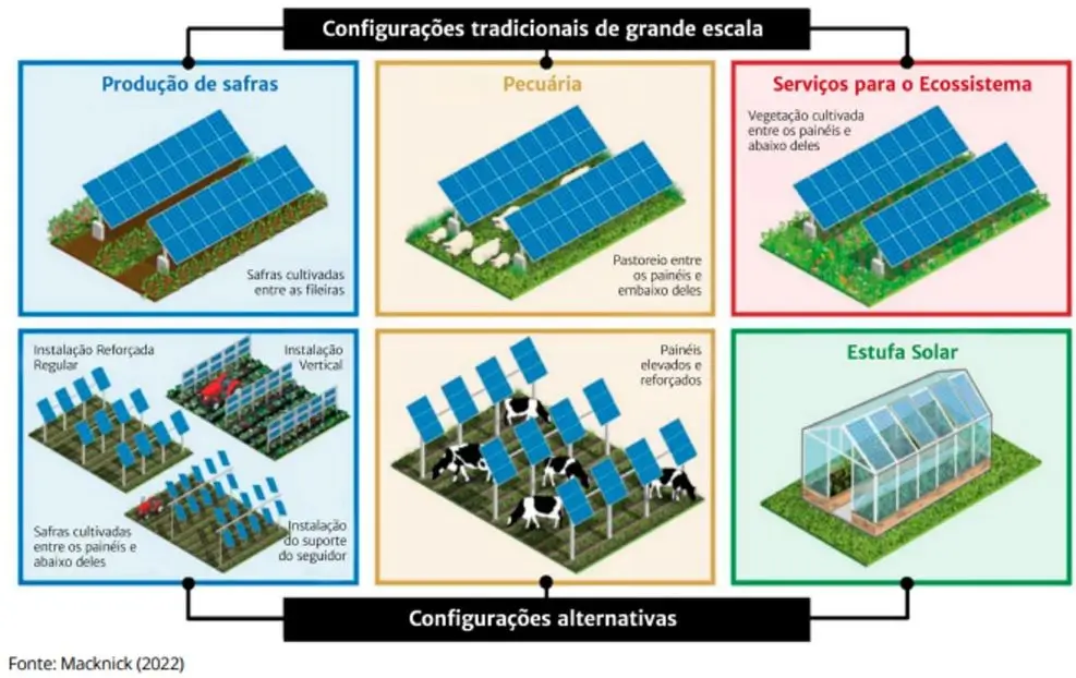 O consorciamento entre fazendas solares e fazendas agrícolas compõe um conceito emergente conhecido como agrivoltaico, ou agrifotovoltaico, na qual os painéis solares podem apresentar uma sinergia com as culturas agrícolas.