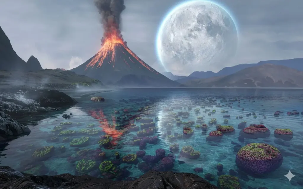 Representação artística da paisagem do Arqueano. Imagem figurativa: Wikipedia. Customizada pela IA Gemini, do Google.