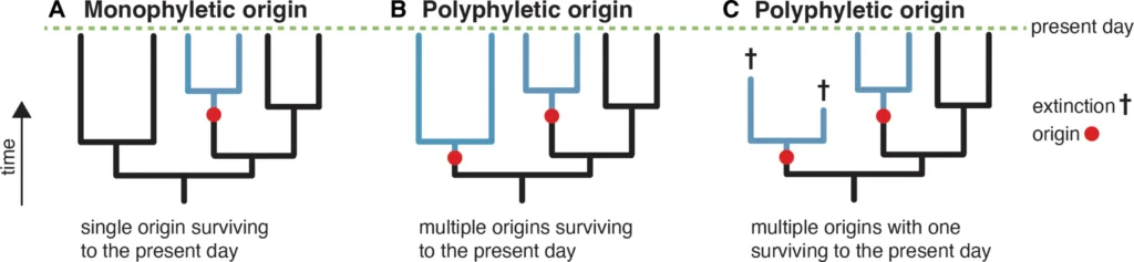 (A) O padrão filogenético reconstruído quando uma dada inovação evolutiva é restrita a um único clado vivo (grupo monofilético), o resultado de uma única origem (designada pelo ponto vermelho). (B) O padrão filogenético reconstruído quando uma dada inovação evolutiva é encontrada em dois clados vivos diferentes, o resultado de duas origens independentes. (C) O padrão filogenético reconstruído quando uma inovação evolutiva é restrita a um único clado vivo, mas como resultado da extinção de linhagens que evoluíram independentemente a inovação. Imagem: Daniel B. Mills et al. – 10.1126/sciadv.ads5698