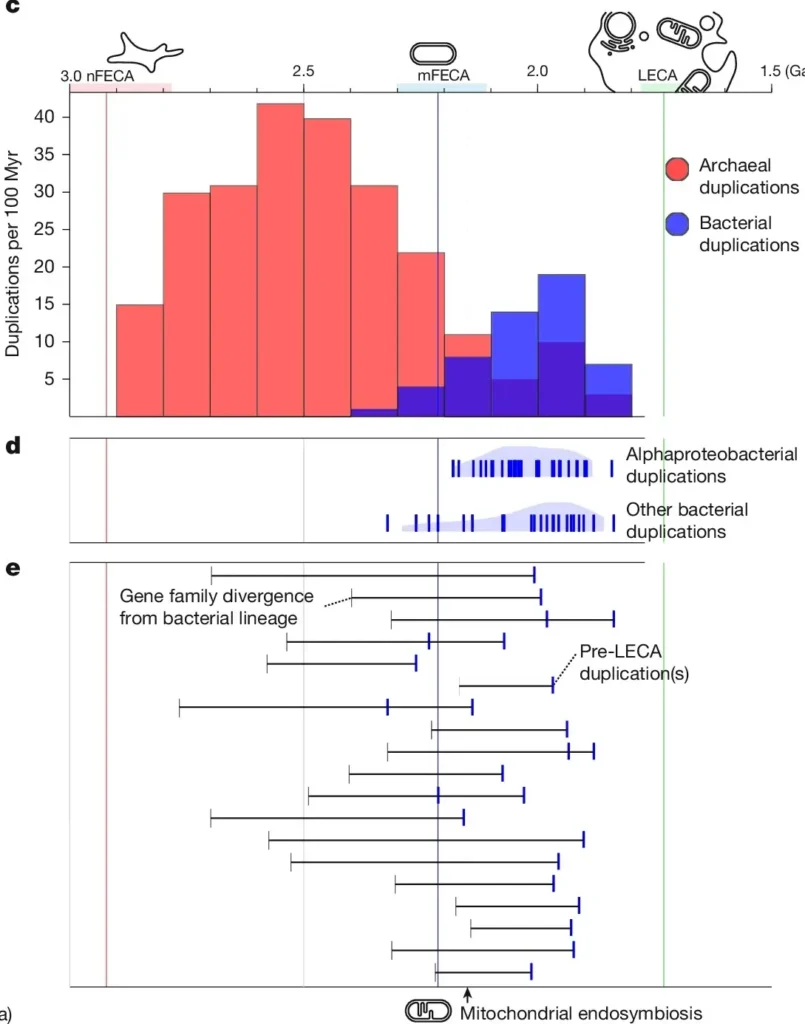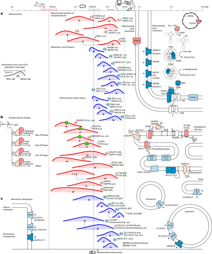 Duplicações pré-LECA na mitocôndria e na biologia das endomembranas. a , Observa-se a duplicação de múltiplas famílias de genes de origem alfaproteobacteriana dentro de 200 milhões de anos após o mFECA; hipotetizamos que o início dessas duplicações corresponde ao momento da endossimbiose mitocondrial.
