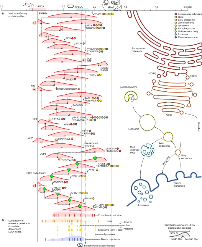 Duplicações pré-LECA em proteínas de tráfego vesicular eucarióticas. Diversas famílias de genes de ancestralidade arqueana participam dos processos de transporte de materiais entre os componentes do sistema de endomembranas dos eucariotos atuais. imagem. Artigo: https://www.nature.com/articles/s41586-025-09808-z